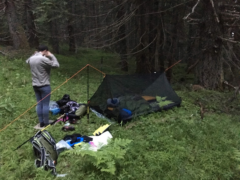The clear drawback of this plan became evident as condensation began soaking us from the inside, under the tarp. In addition, puddles began forming around us inside the bug shelter soaking the feet and sides of our bags. Feeling defeated, we quietly settled in for a night of wet tossing and turning with little to no sleep. The lesson we learned was clear: bite the bullet and set up your shelter properly at the first hint of weather. 16.5 miles and a monkey butt load of climbing on the day.